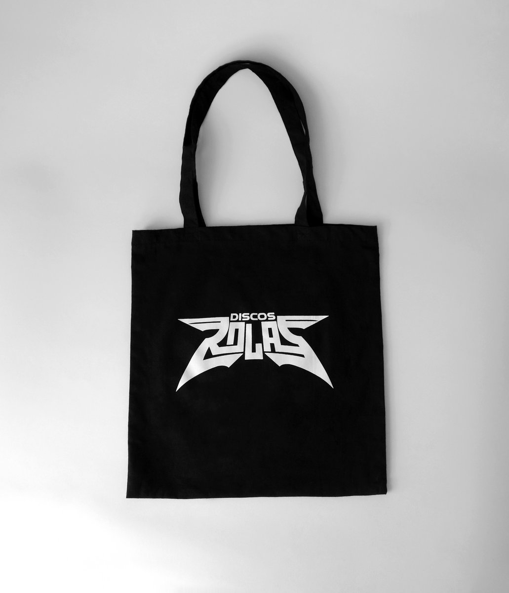 Sturdy black tote bag with white Discos Rolas logo. 100% Cotton Canvas